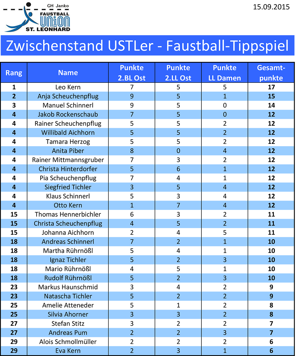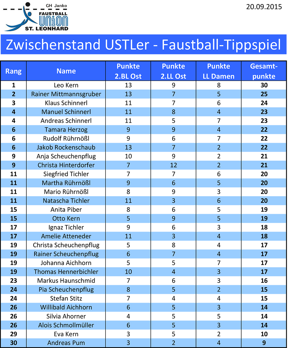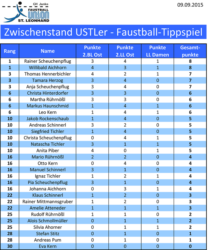 Tipp-Spiel: Zwischenstand 3.0 Veröffentlicht am 21. September 201521. September 2015 von Mario Rührnößl Der Zwischenstand nach der vorletzten gespielten Runde vom 20.09.2015 Der Zwischenstand nach der zweiten gespielten Runde vom 12.09.2015 Hier nun der erste Zwischenstand nach der ersten gespielten Runde vom 05.09.2015