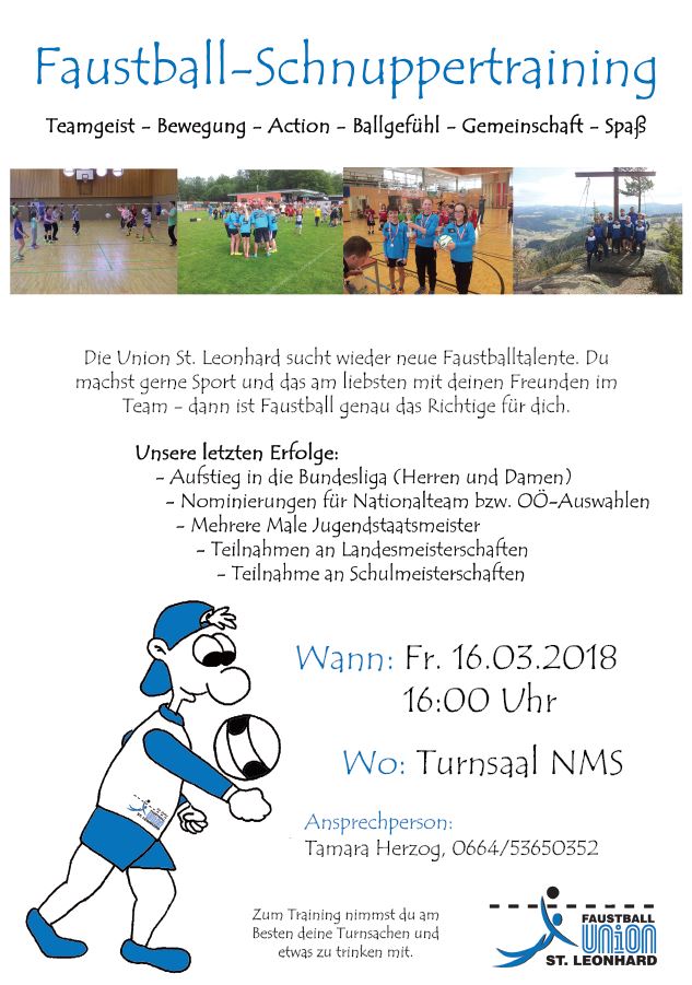 Faustball Schnuppertraining Veröffentlicht am 26. Februar 201826. Februar 2018 von Mario Rührnößl Wir laden alle sportbegeisterten Kinder zum Faustball-Schnuppertraining ein. Wann: Freitag, 16.03.2018 um 16:00 Uhr Wo: Turnsaal NMS St. Leonhard Schnuppertraining 2018