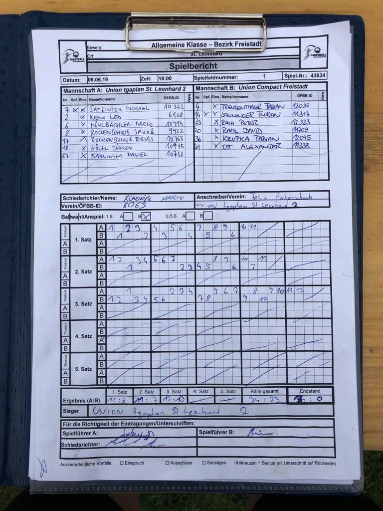 Bei der vorletzten Runde der Bezirksliga hatte die Heimmannschaft aus Leonhard die Chance den Meistertitel bereits vorzeitig zu fixieren. Aufgrund dessen, dass Union Waldburg nicht angetreten ist, bestritt man nur eine Partie gegen Freistadt. In diese starteten wir sehr gut, die ersten beiden Sätze konnten ohne große Probleme sicher heimgespielt werden. Im dritten Satz verpasste man etwas den Start und lag rasch mit 1:6 hinten, doch mit viel Kampfgeiste schaffte man es wieder Punkte gut zu machen. Nun wurde es spannend beim Stand von 10:8 für Freistadt, doch Leonhard konnte beide Matchbälle abwehren und schlussendlich auch den dritten Satz mit 12:10 für sich entscheiden. Nun ist es fix, WIR SIND MEISTER!
