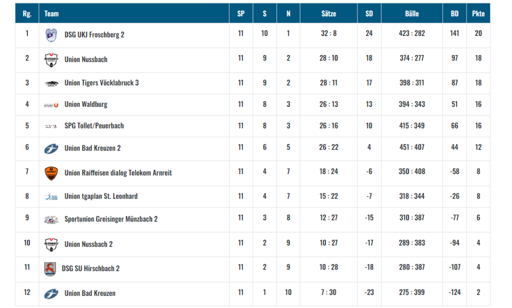 | Union tgaplan St. Leonhard : Sportunion Greisinger Münzbach 2 | 1:3 (7:11/6:11/11:6/10:12) |